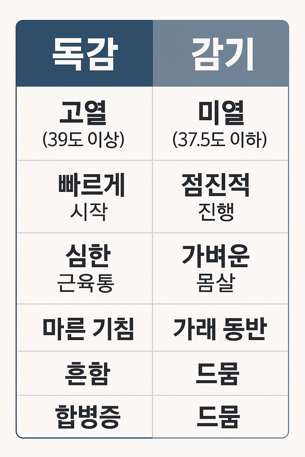 보통 감기와 혼동되지만, 증상이 훨씬 빠르고 심하게 나타나는 것이 특징입니다.