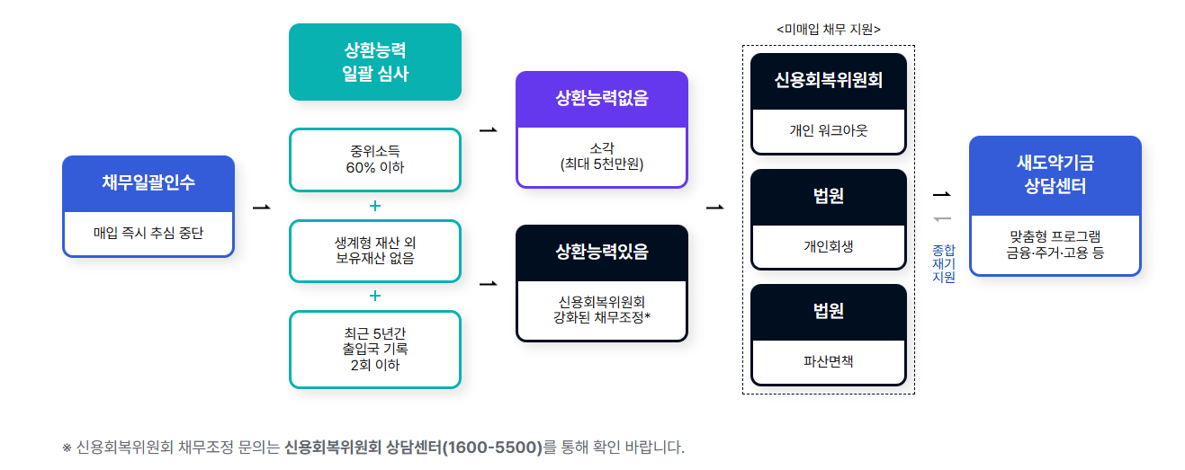 정부가 연체 채권을 금융사로부터 매입하고, 내부 심사를 거쳐 대상자를 자동 선별합니다.