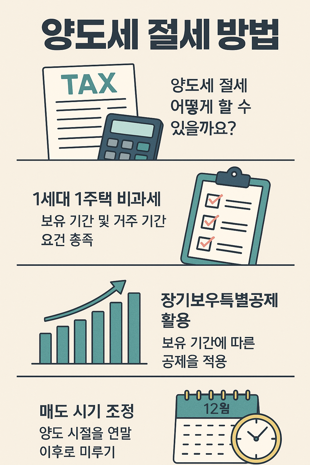 핵심: 과세표준을 줄이면 세금이 줄어듭니다. 보유·거주 기간 관리와 필요경비 증빙이 절세의 핵심입니다.