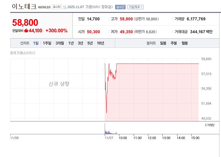 이노테크는 상장 첫날 시초가부터 강한 매수세를 받으며 급등했고, 장중 꾸준한 상승세로 상한가에 도달했습니다. 이는 2025년 들어 9개월 만에 등장한 따따블 사례입니다.