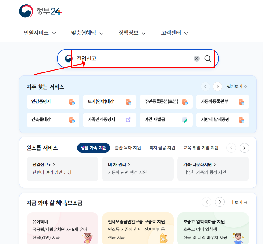→ 검색창에 ‘전입신고’ 입력 후 전자민원 신청 클릭
