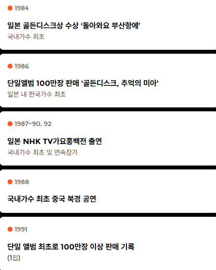 - 데뷔: 1969년 미 8군 무대 / 1975년 '돌아와요 부산항에'