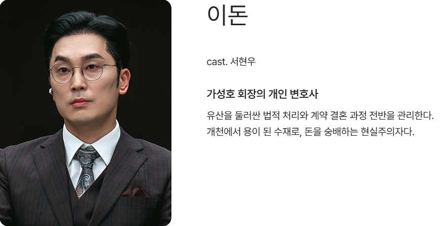 - 이돈: 회장 측 변호사, 냉철하지만 속을 알 수 없음