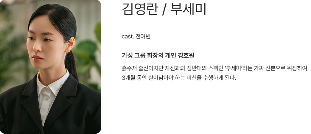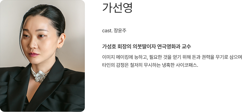 - 가선영: 회장의 의붓딸, 부세미를 경쟁자로 보는 인물