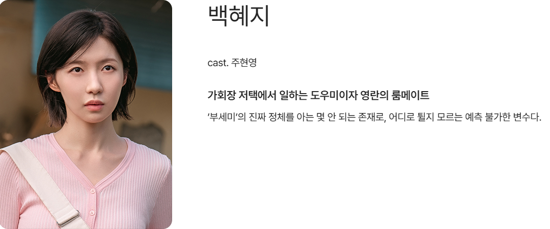 - 백혜지: 부세미의 룸메이트. 정보는 많지만 어느 편인지는 애매함