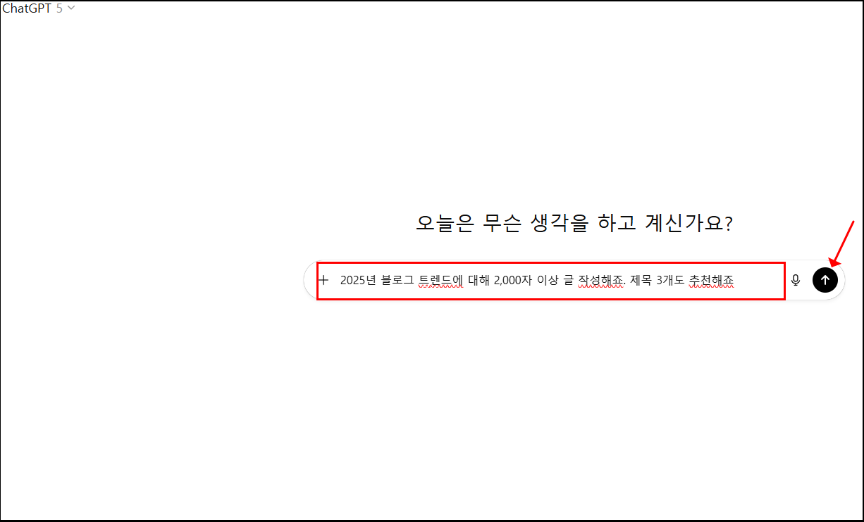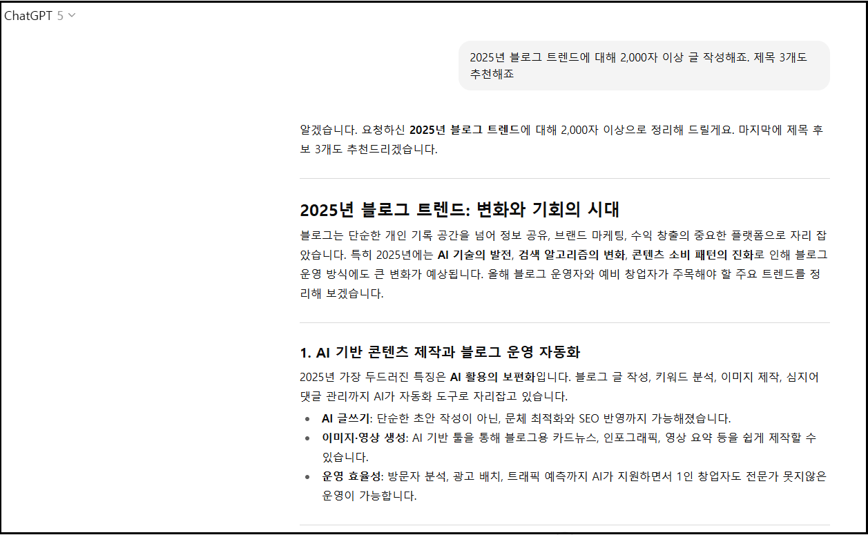 “2025년 블로그 트렌드에 대해 2,000자 이상 글 작성해줘. 제목 3개도 추천해줘.”