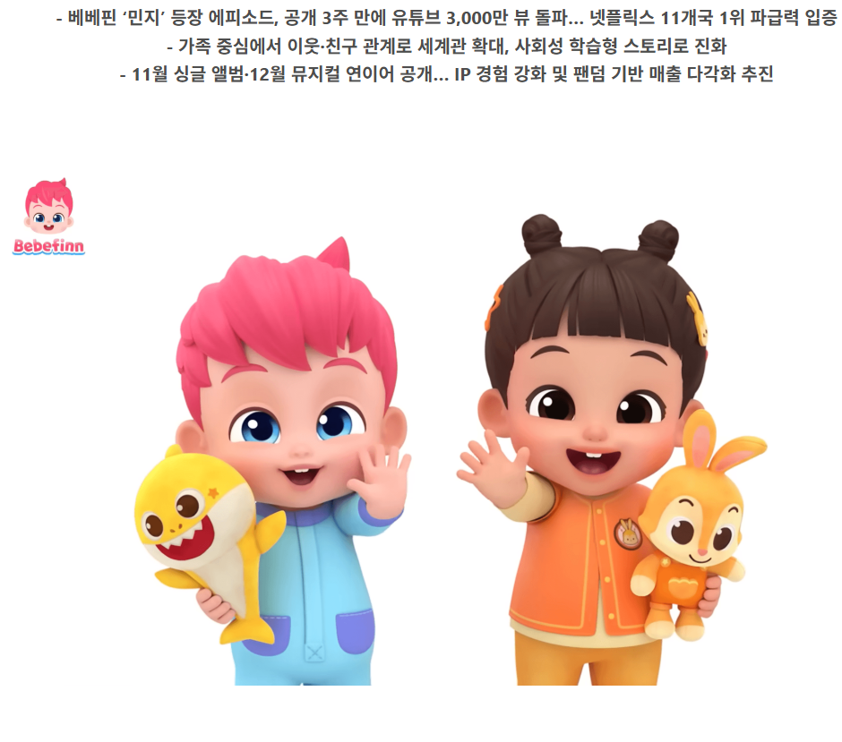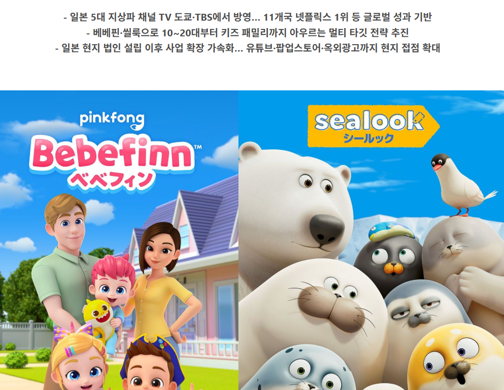- ‘핑크퐁’과 ‘아기상어’ 외에도 베베핀, 씰룩, 키키팝팝 등 다양한 캐릭터 IP 보유