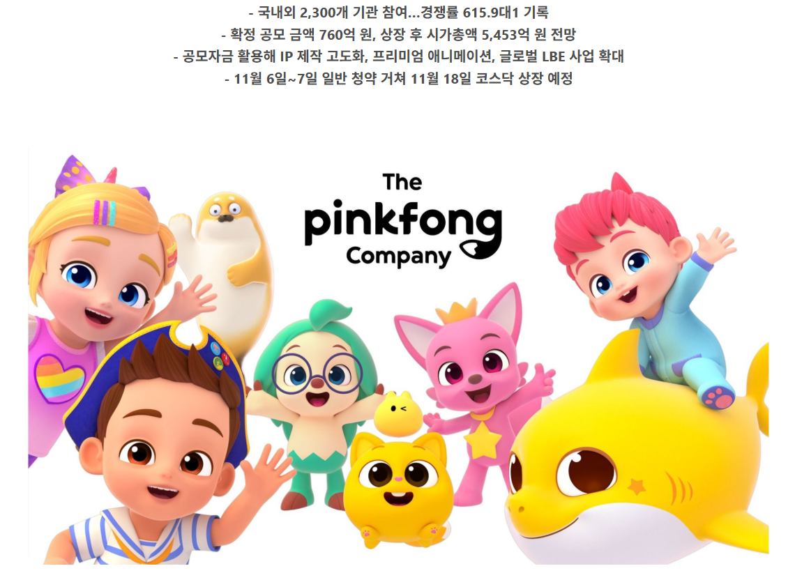 글로벌 유아 콘텐츠 기업 더핑크퐁컴퍼니가 2025년 코스닥 시장에 상장합니다. ‘핑크퐁’과 ‘아기상어(Baby Shark)’ 등으로 세계적인 인기를 끈 이 기업은 최근 수요예측을 마치고, 공모가를 희망 밴드 상단인 38,000원으로 확정했습니다.