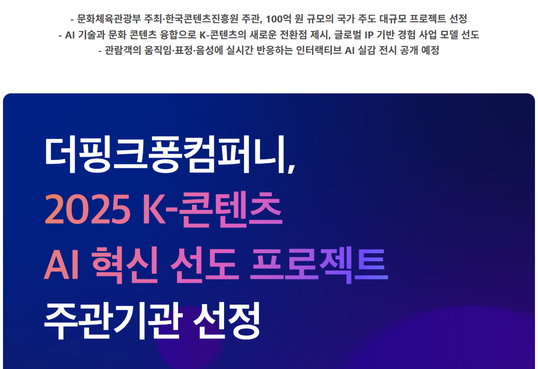 특히, 한국콘텐츠진흥원이 주관하는 **'K-콘텐츠 AI 혁신 선도 프로젝트'**의 주관기관으로 선정되어 총 100억 원 규모의 지원을 받아 AI·IP 융합형 콘텐츠 플랫폼 구축에도 나섭니다.