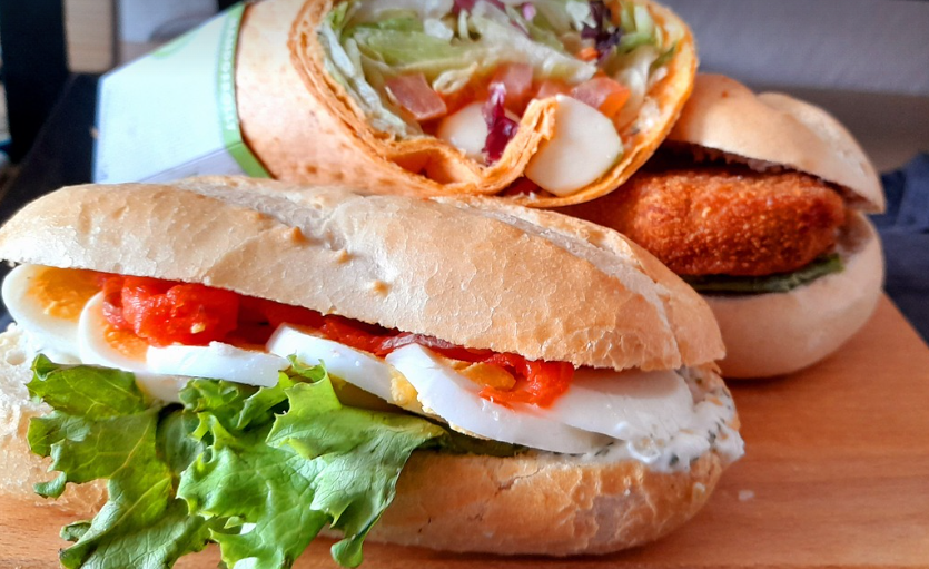 - 재료: 통밀 식빵, 달걀샐러드 또는 병아리콩 샐러드, 오이, 당근채