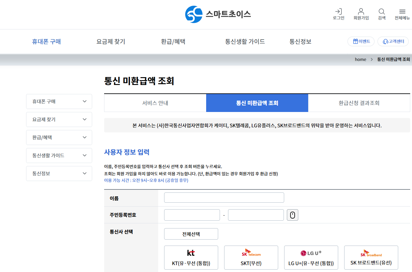 📌 스마트초이스(www.smartchoice.or.kr)에서도 통신비 미환급액을 한 번에 조회할 수 있습니다.